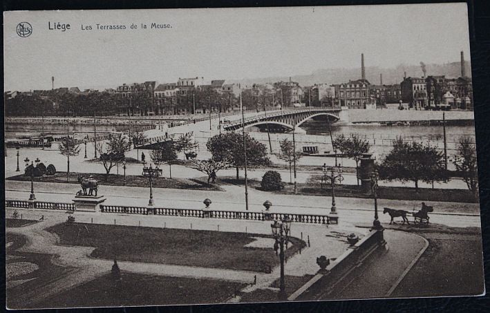Op de kaart is langs de kant van de Maas het bronzen beeld te zien van “Le Cheval de halage”. Dit beeld werd in 1885 onthuld en is van de hand van Jules Halkin.