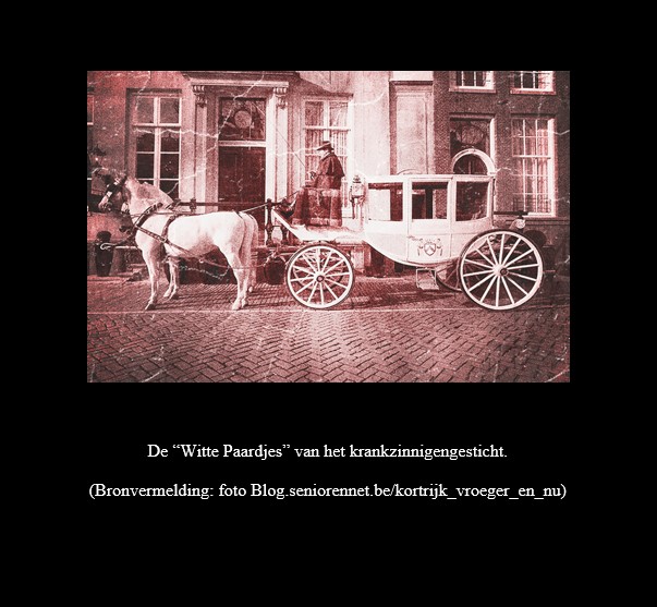 Men hoort in Kortrijk nog regelmatig de zin “Pas op of de Witte Paardjes komen u halen ! ”. Dit is nog een overblijfsel van toen “Geestesgestoorden” in onze streek nog werden vervoerd naar een gesticht met een karos getrokken door twee witte paarden. En nu nog zegt de Kortrijkse volksmond bij het horen van onwijze praat: “We gaan hem op Sint-Anna steken !"