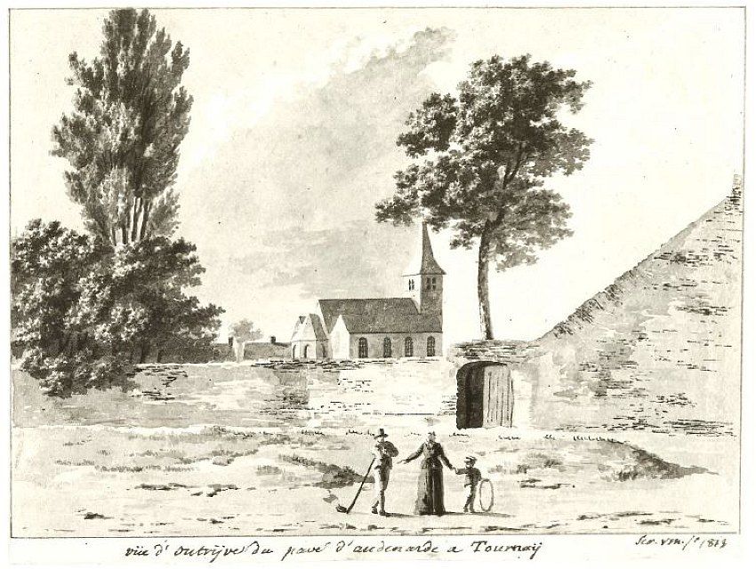 Op deze tekening van Séraphin Vermote van 1813 is de Sint-Pieterskerk te zien in Outrijve. Outrijve is thans een deelgemeente van Avelgem.
