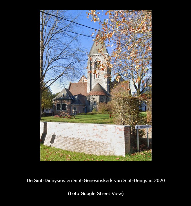 Op deze prent van Séraphin Vermote van 1813 is de Sint-Dionysius en Sint-Genesiuskerk te Sint-Denijs.