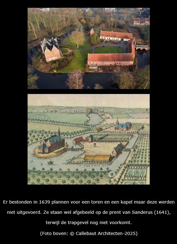 Ze staan wel afgebeeld op een prent van Sanderus (1641), terwijl de trapgevel nog niet voorkomt. Blijkbaar kregen
