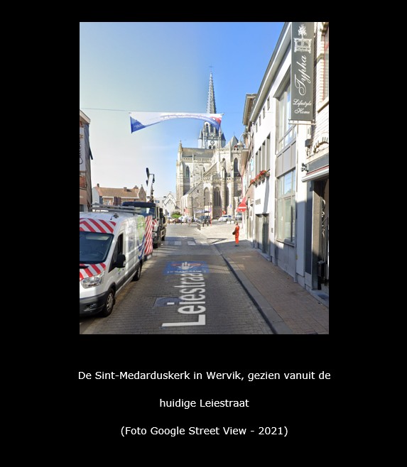 Op deze tekening van 1813 van Séraphin Vermote is de Sint-Medarduskerk van Wervik (provincie West-Vlaanderen) te zien, gezien vanuit de huidige Leiestraat.