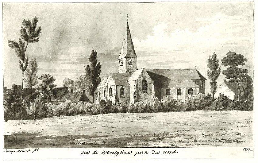 Op deze tekening van Séraphin Vermote uit 1813 is de Sint-Hilariuskerk van Wevelgem (provincie West-Vlaanderen) te zien.