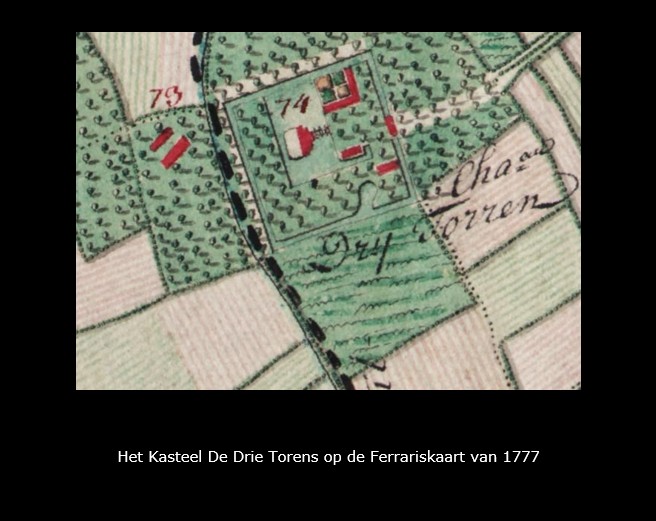 De Hoeve “De Drie Torren” was niet de hoeve van het voormalige neerhof van het Kasteel De Drie Torens. Dit neerhof situeerde zich namelijk ten westen van het kasteel (zie de Ferrariskaart hieronder) en niet langs de oostelijke kant.