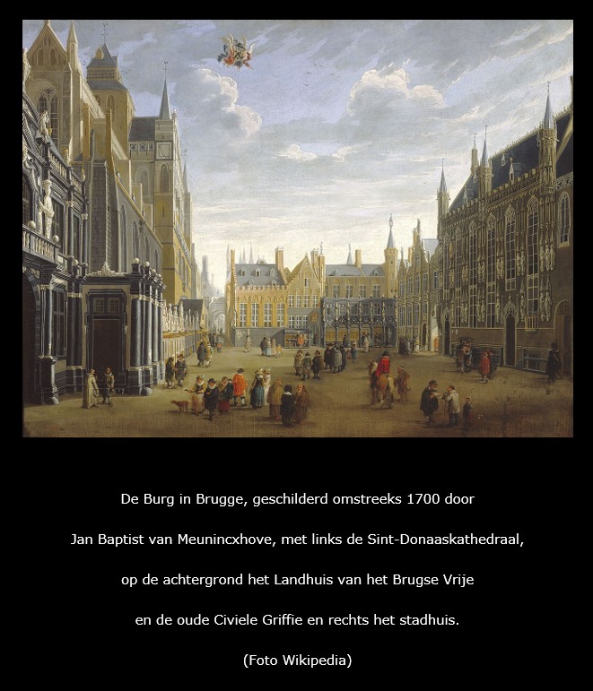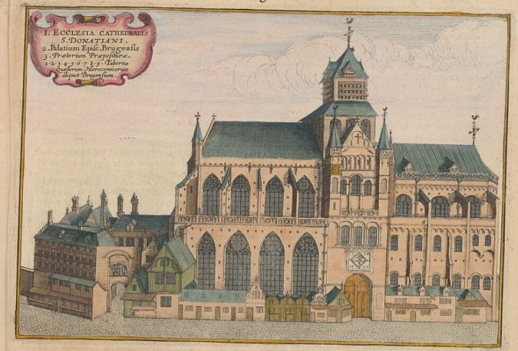 Op deze mooie prent van Sanderus is de indrukwekkende Sint-Donaaskathedraal te zien in Brugge in de huidige provincie West-Vlaanderen. Deze kathedraal was gelegen op de Burg in Brugge en bestaat thans niet meer.