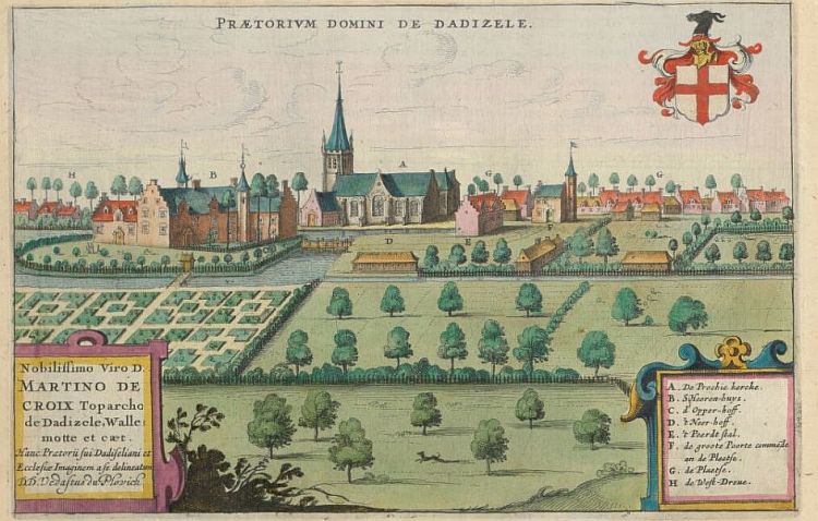 Op de prent is vlakbij de kerk een indrukwekend kasteel te zien. Deze waterburcht werd bewoond door de heren van Dadizele. Op de prent is ook het neerhof van de burcht te zien.