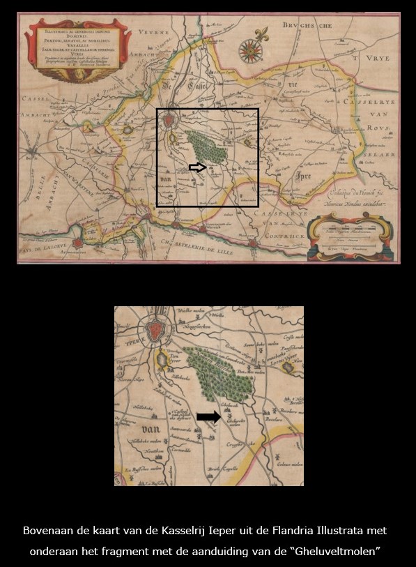 Op deze uitsnede van de kaart van de Kasselrij Ieper van Sanderus staat de molen “Gheluveltmolen” getekend.