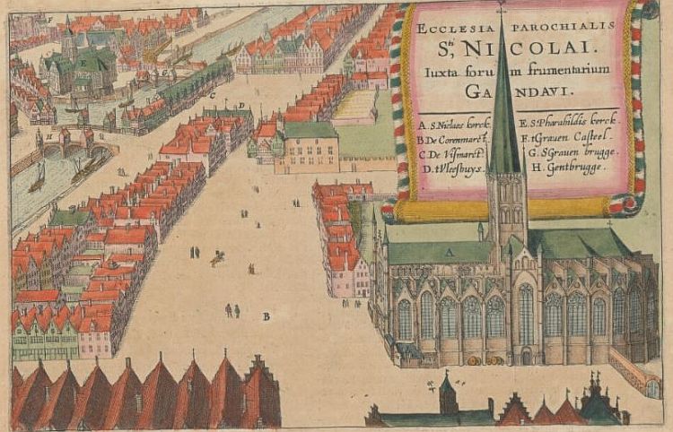 Op deze prent van Sanderus is de Sint-Niklaaskerk te zien in Gent (provincie Oost-Vlaanderen) omstreeks 1640.