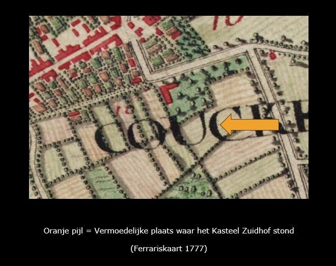 Het Zuidhof zien we hier aangeduid als een omwald kasteel met een spits torentje.