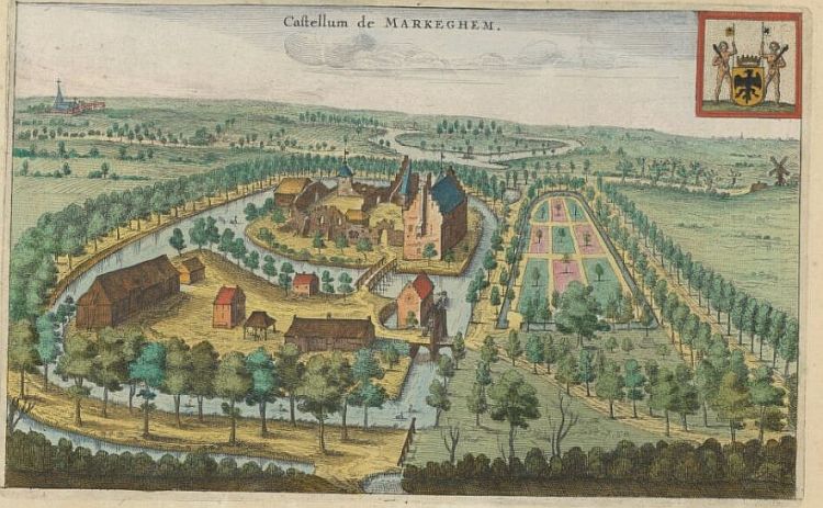 Op deze prent van Sanderus zijn het opperhof en het neerhof van het zogenaamde “Goed Ter Hoyen” te zien in Markegem, zoals dit er omstreeks 1640 moet hebben uitgezien.