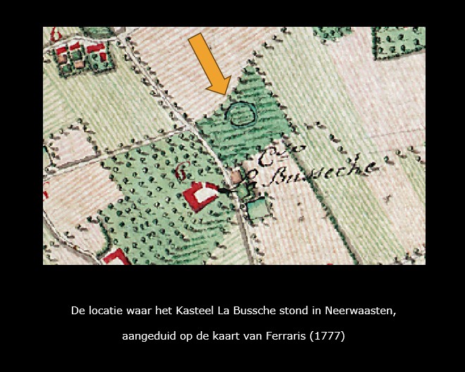 Op deze prent van Sanderus is het Kasteel La Bussche, ook wel Kasteel van Neerwaasten genoemd, te zien.