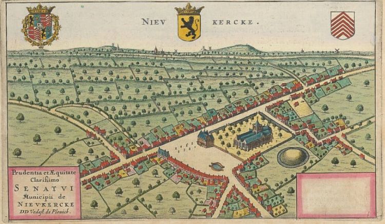 Op deze prent van Sanderus van 1641 is een panorama te zien van het dorp Nieuwkerke.