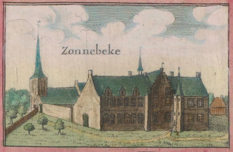 Op deze prent van Sanderus van omstreeks 1640 is de Augustijnenabdij van Zonnebeke (provincie West-Vlaanderen) te zien.