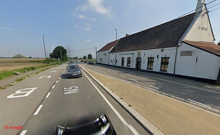 Hieronder zie je de hoeve op een foto van Google Maps van 2021 te zien; aan de linkerzijde is in de verte de heuevel met de Leeuw van Waterloo te zien.